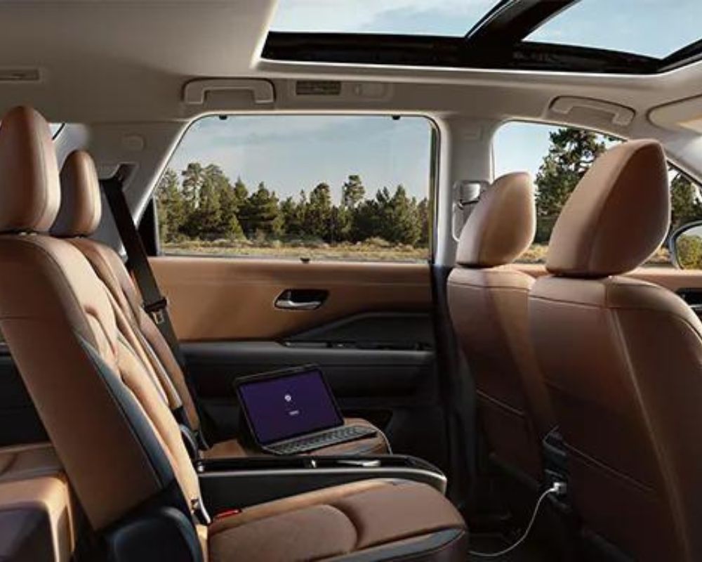 Additionally, the Pathfinder offers a convenient pass-through console that provides ample storage space for front and rear passengers, ensuring easy access to stored items while maintaining a clutter-free environment. Whether it's small personal belongings or larger items, the interior of the Pathfinder is thoughtfully designed to accommodate all your needs.